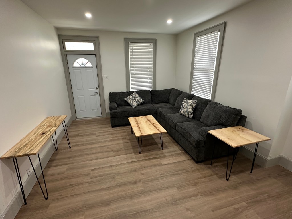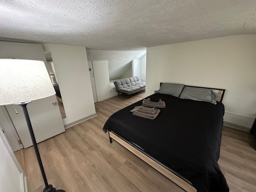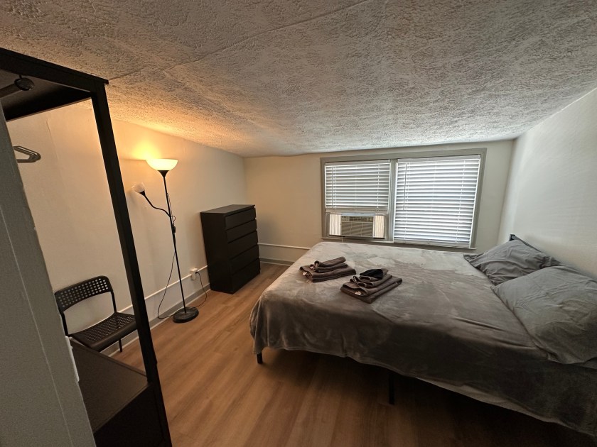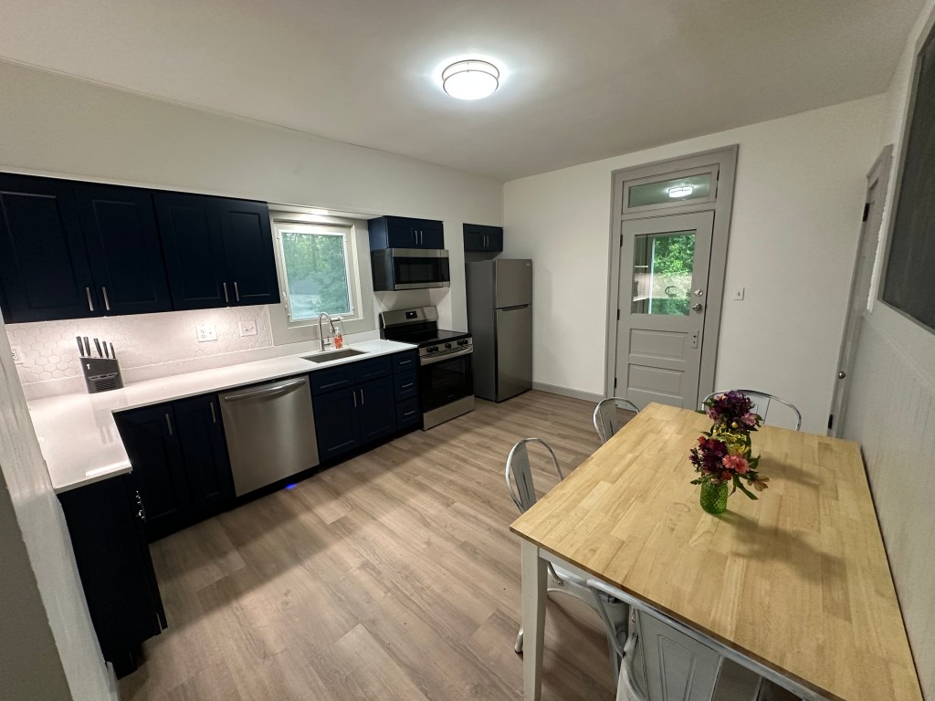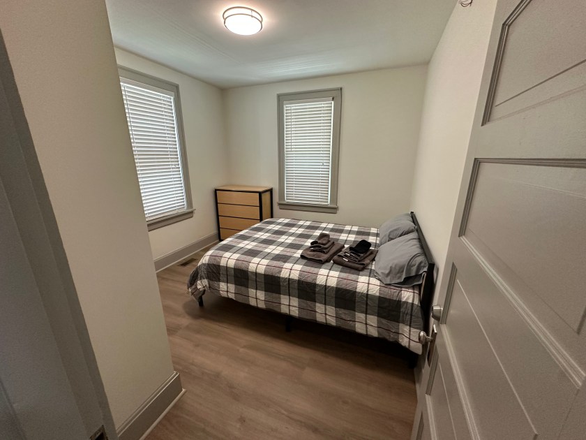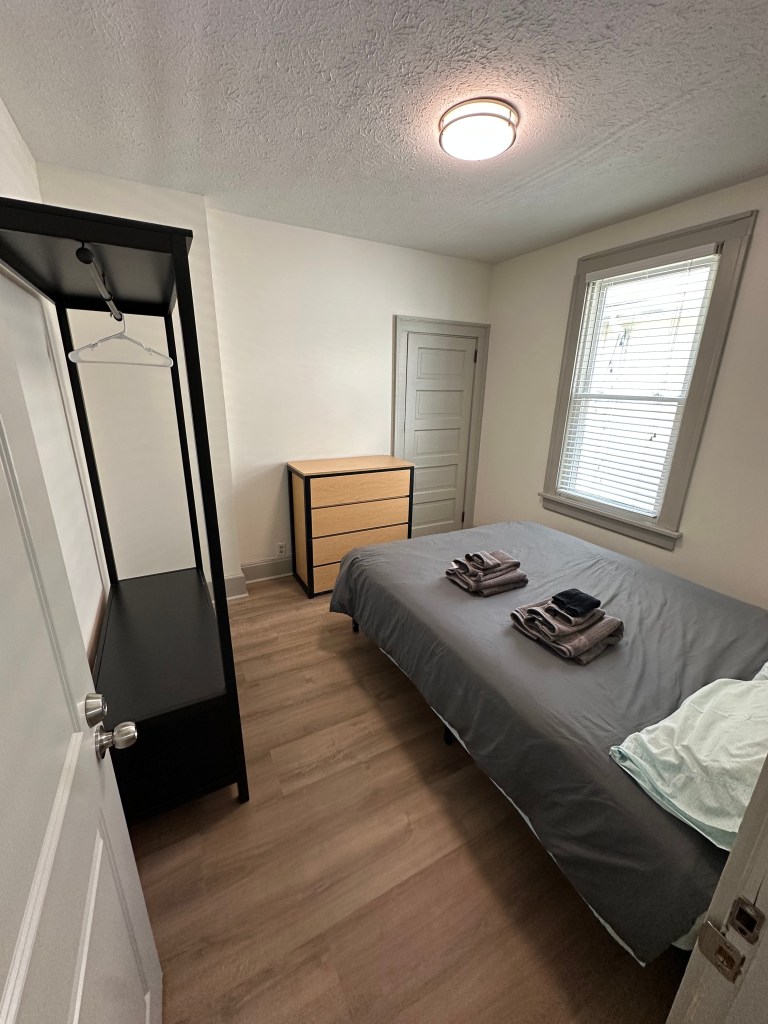 This house was renovated in 2025 and features new flooring, new kitchen, bathrooms and all new queen sized beds. This is a furnished house with 4 bedrooms, 2 full bathrooms, and has 1500 sq ft. The bedrooms each have beds, dressers, desks. The eat-in kitchen comes with a table and chairs, dishwasher., microwave, disposal and quartz countertop. The house also has central air, washer/dryer, water softener and whole house water filter, off street parking, self-locking keyless entry, shed for storage of bikes, etc.